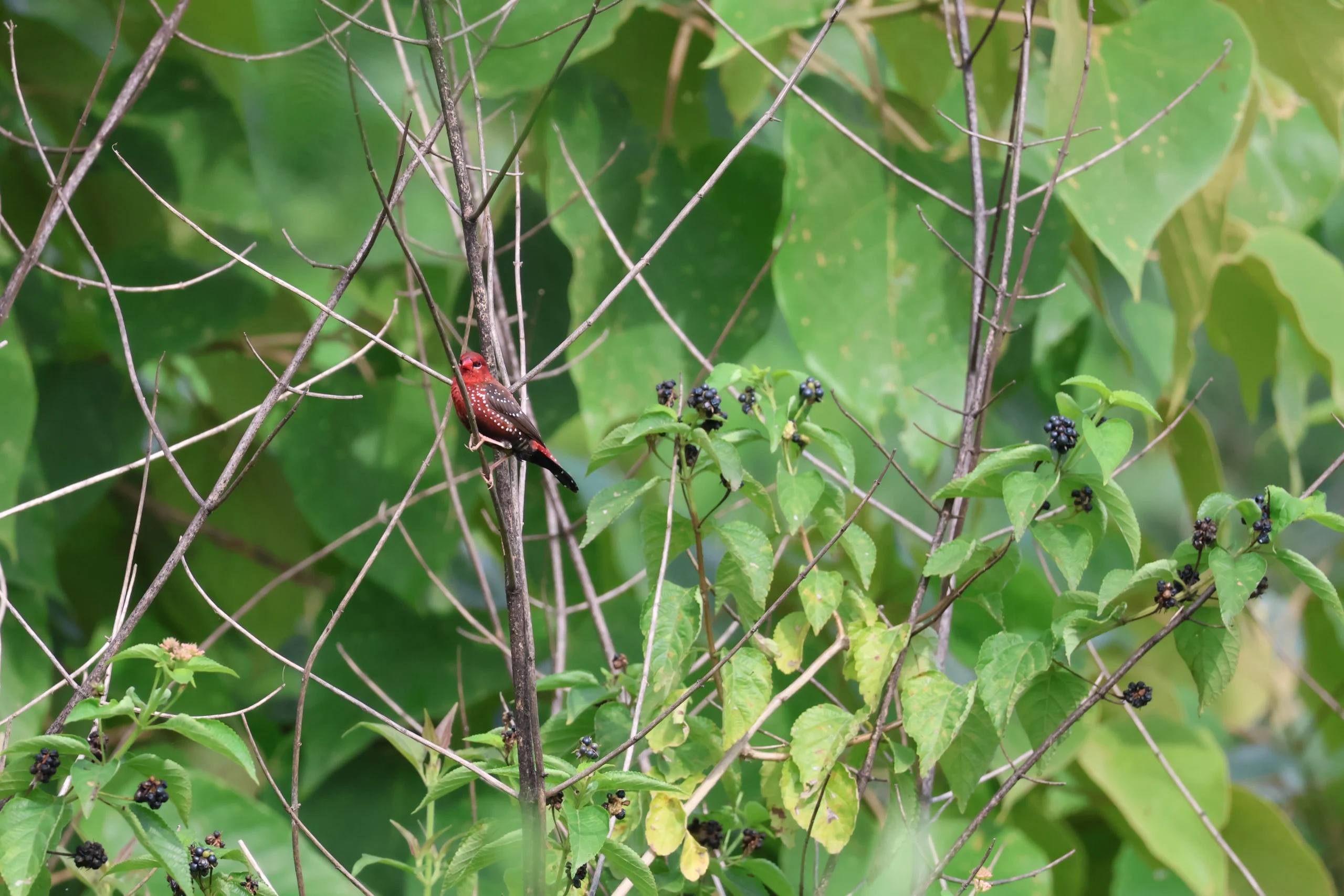 The group recorded an impressive 33 bird species, including forest regulars like Indian Peafowl, Laughing Dove, Black Drongo, Spot-breasted Fantail, Rufous Treepie, Asian Tit, Red-vented Bulbul adding colors to the lush green forest.